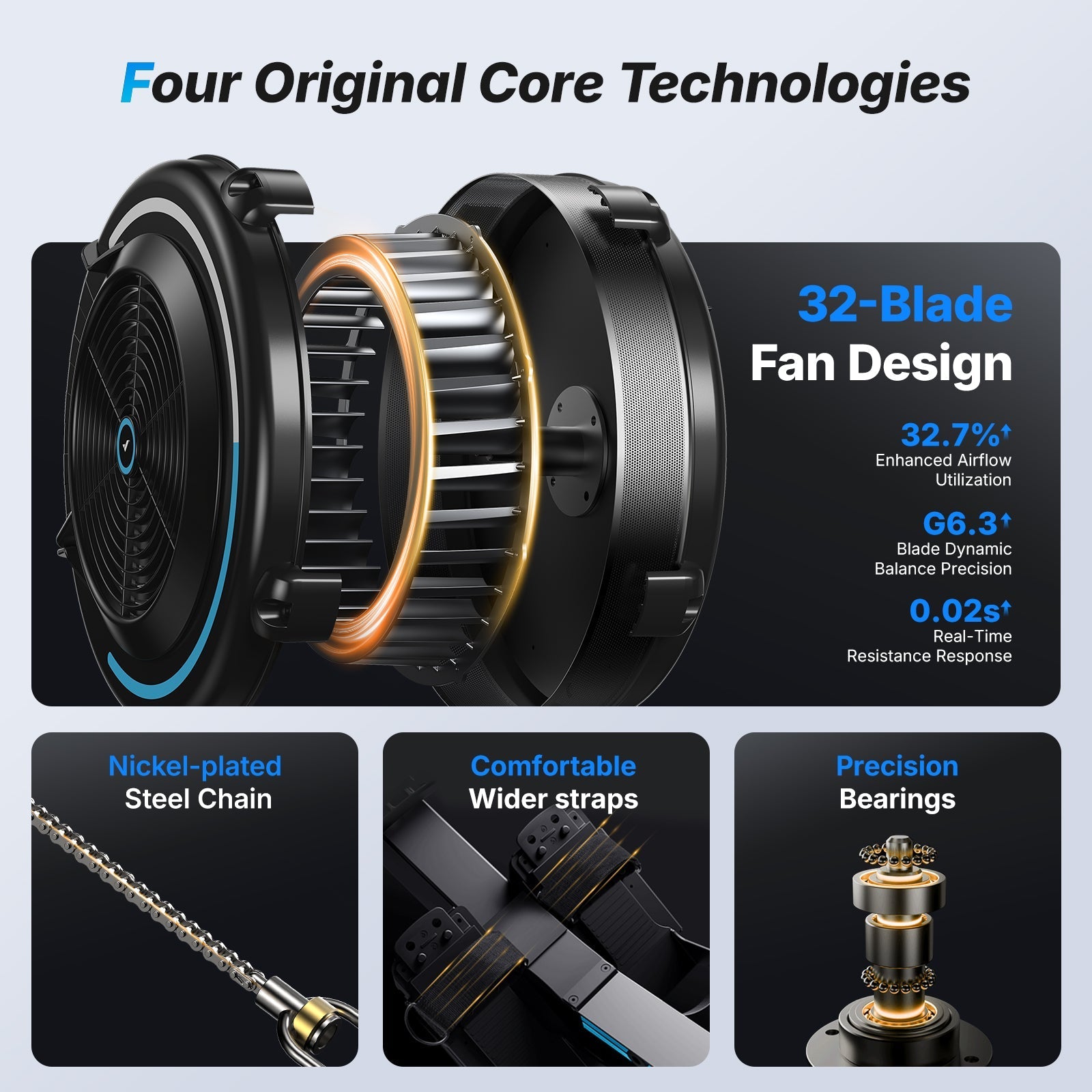 The NovaRow R50 features a 32-blade fan that ensures ample resistance and enhanced stability even during high-speed rowing. With 10 adjustable air intake levels, you can customize the resistance to your preferred intensity, reaching a peak resistance of 110 pounds. This rower is sufficient for beginners progressing to advanced rowers.
