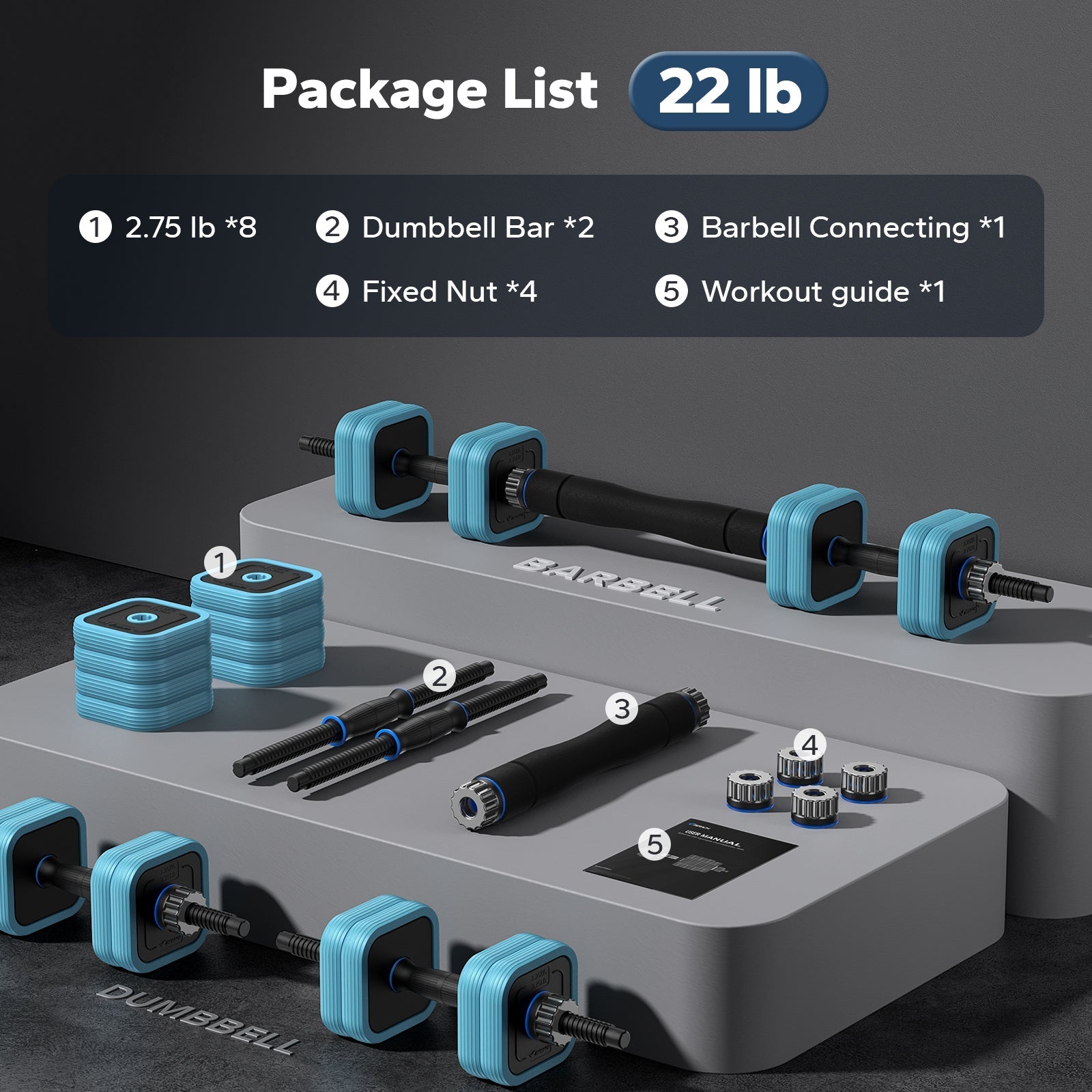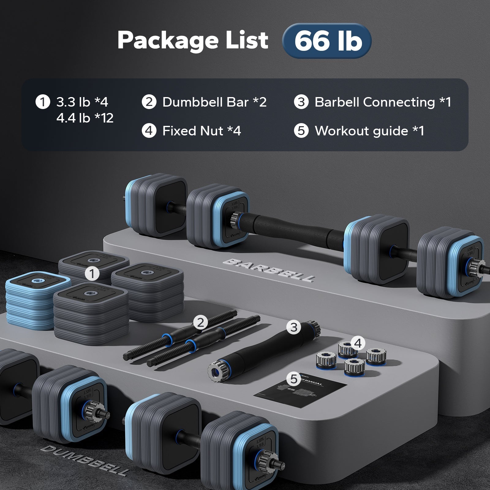 MERACH dumbbells set offers different weight combinations. With removable dumbbell plates, you can quickly adjust the weight of individual dumbbells. 44lbs individual dumbbell adjustable weight range of 5.5lbs-22lbs; barbell adjustable range of 5.5lbs-44lbs This set of easy to install fitness equipment to meet the needs of different stages of your workout intensity.