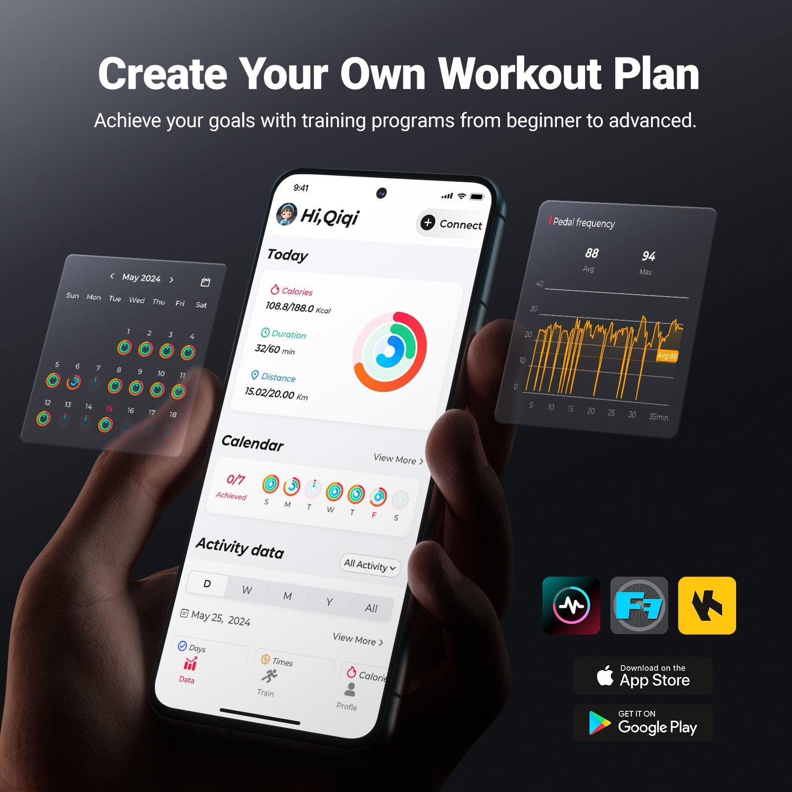 The MERACH and FantomFite apps at no subscription fee to track real-time metrics like distance, time, calories, speed, and resistance. Syncs with Apple Health and Google Fit, and offers online trainers for professional guidance