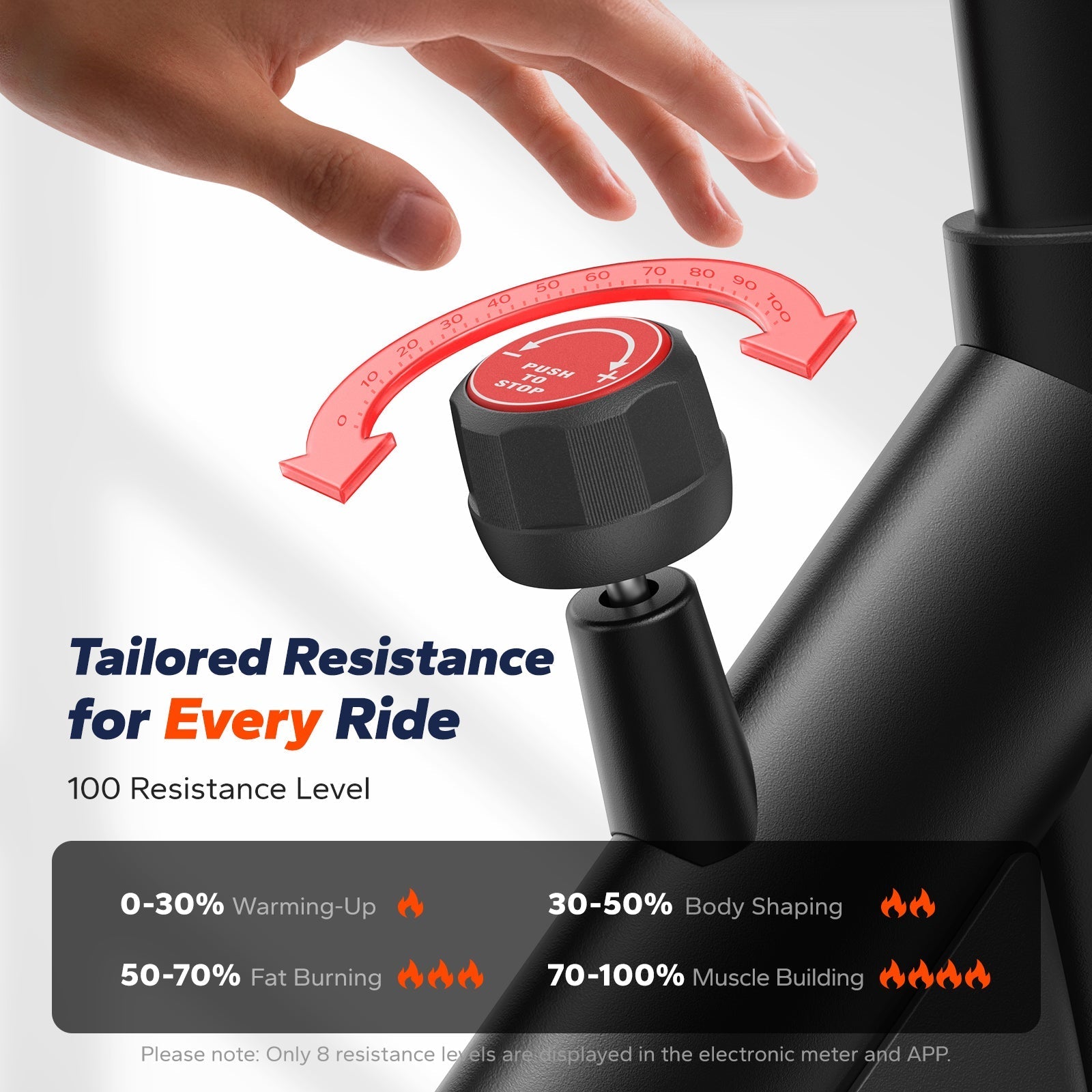 • Infinite Resistance Bike: Experience full control with 0–100% adjustable resistance. From light warm-ups to high-resistance bike training, it adapts to every fitness level. (Note: The display only shows 8 resistance levels.)