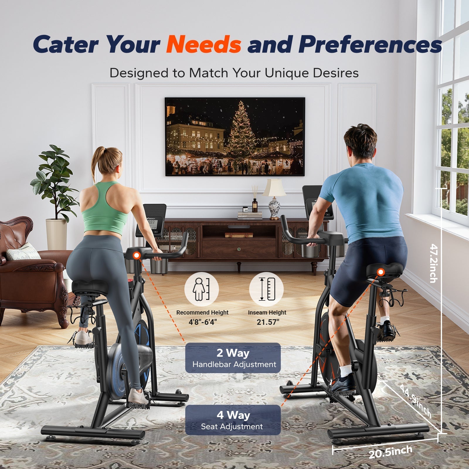• Versatile & Silent: This resistance exercise bike features a 2-way adjustable handlebar and 4-way adjustable seat, fitting users from 4'8'' to 6'4''. Operating at under 25 dB, it offers a quiet and smooth ride, while the durable ABS pulley ensures long-lasting, reliable performance.